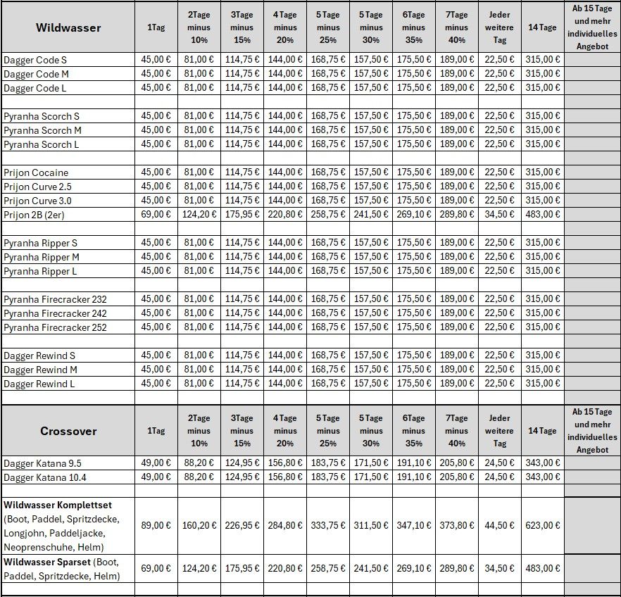 | Touren Paddel | 10,- € | 18,- € | 25,- € | 32 ,- € | 37,- € | 42,- € | 45,- € | 5,- € | 70,- € | |