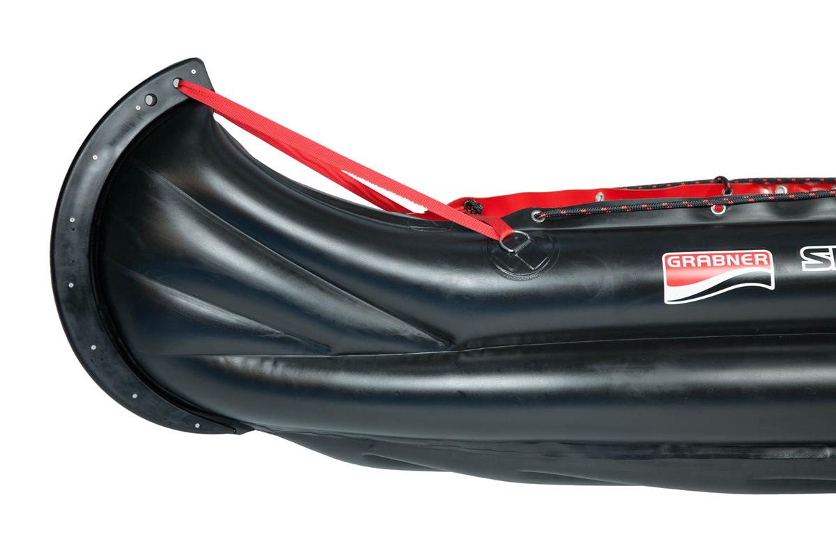 Eine kräftige Bugleiste schützt die Bootshaut beim Anprallen. An dem Gurt kann das Boot getragen und Gepäck fixiert werden, zudem erleichtert er das Festhalten nach einer Kenterung.