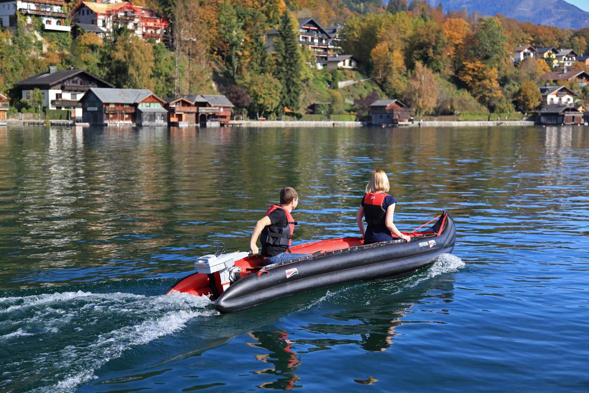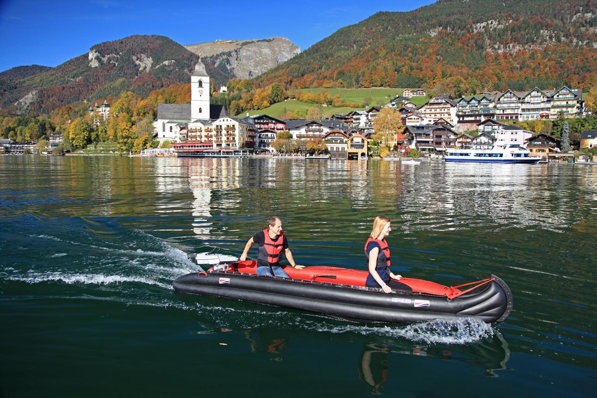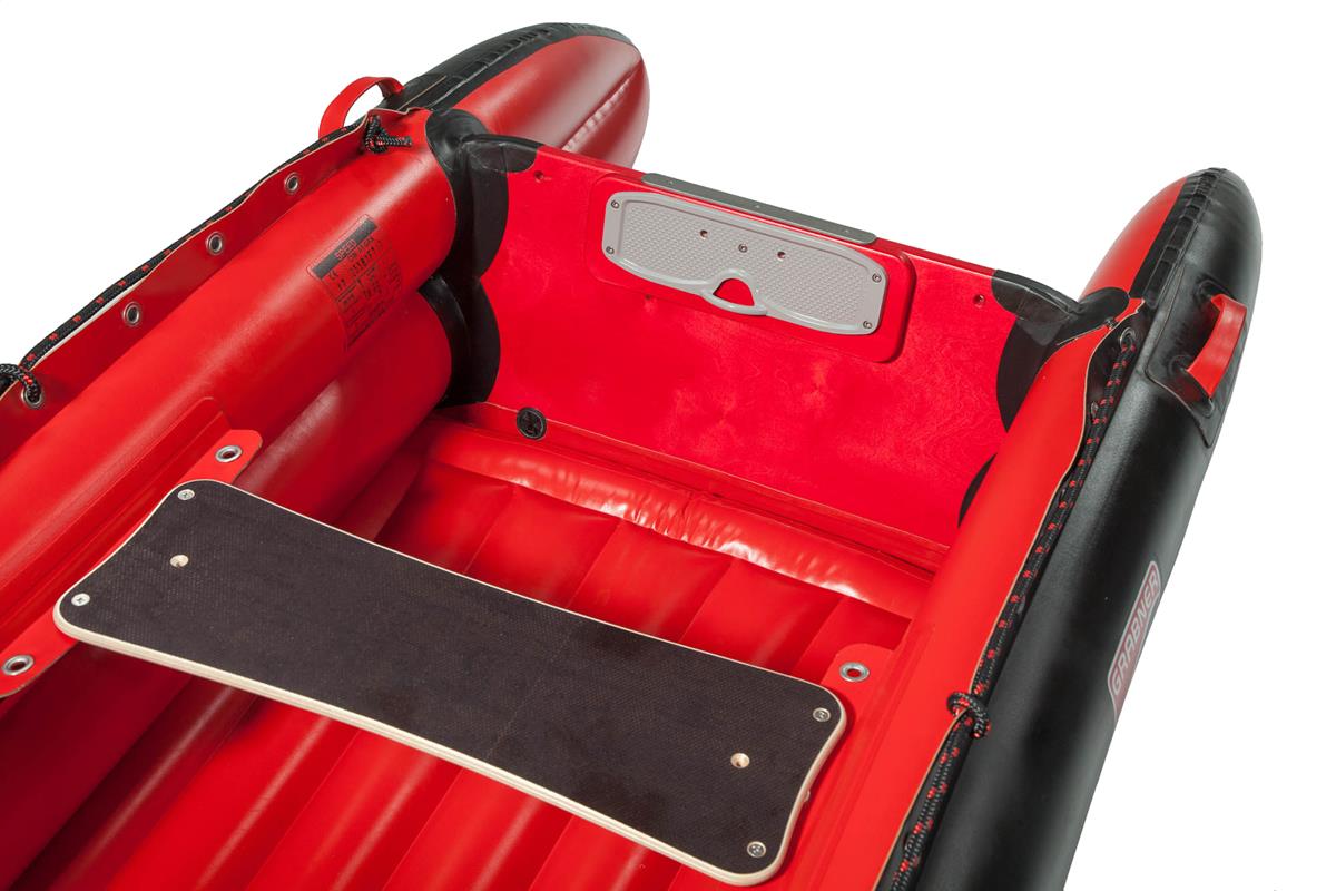 Hohe Seitenwände schützen bei Wellenschlag und bewahren Kinder vor dem Herausfallen; der große Innenraum mit breitem Heckbereich nimmt Zuladung gut auf. Bis zu 3 Sitzbretter für 3 Erwachsene können einzeln in drei Positionen getrimmt werden, an den freien seitlichen Ösen lässt sich Gepäck befestigen.