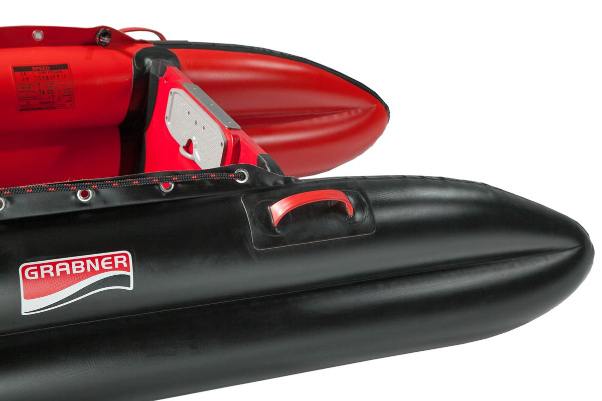 Ganz und gar nicht untragbar sind die Griffe links und rechts am Heck: Zum An- und Festhalten bei einer Kenterung und zum Anheben des Bootes im Trockenen.