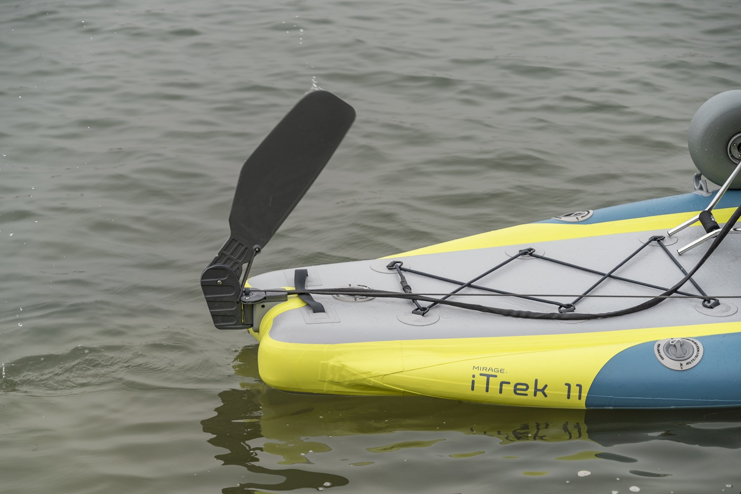 - Ausgestattet mit dem MirageDrive GT mit Kick-Up-Finnen erlaubt das iTrek 11 müheloses Vorwärtsfahren. Sobald die Flossen auf Hindernisse treffen, klappen sie automatisch hoch, um Schäden zu vermeiden – perfekt für flache Gewässer oder Bereiche mit Treibgut.