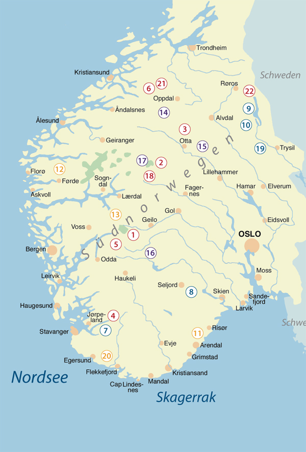 Radtouren: Südküste nach Osten, Fjordland, Rallarvegen, Südwesten.